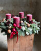 Frischer und moderner Adventskranz in bordaux-braun, bestückt mit hochwertigen, durchgefärbten Kerzen mit langer Brenndauer. Das Grün stammt aus nachhaltigen Gärtnereien.