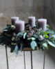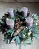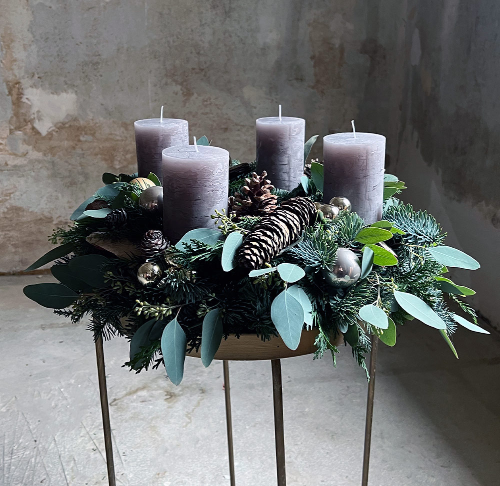 Frischer, moderner Adventskranz meisterlich mit grau-braunen Qualitätskerzen ausgestattet. Goldene Accessoires und frische Zapfen machen den Adventskranz zu einem echten Hingucker ab. Das Grün stammt aus Gärtnereien der Region.